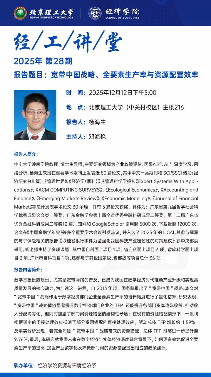 【经工讲堂2025年第28期】12-12 中山大学岭南学院杨海生教授: 宽带中国战略、全要素生产率与资源配置效率