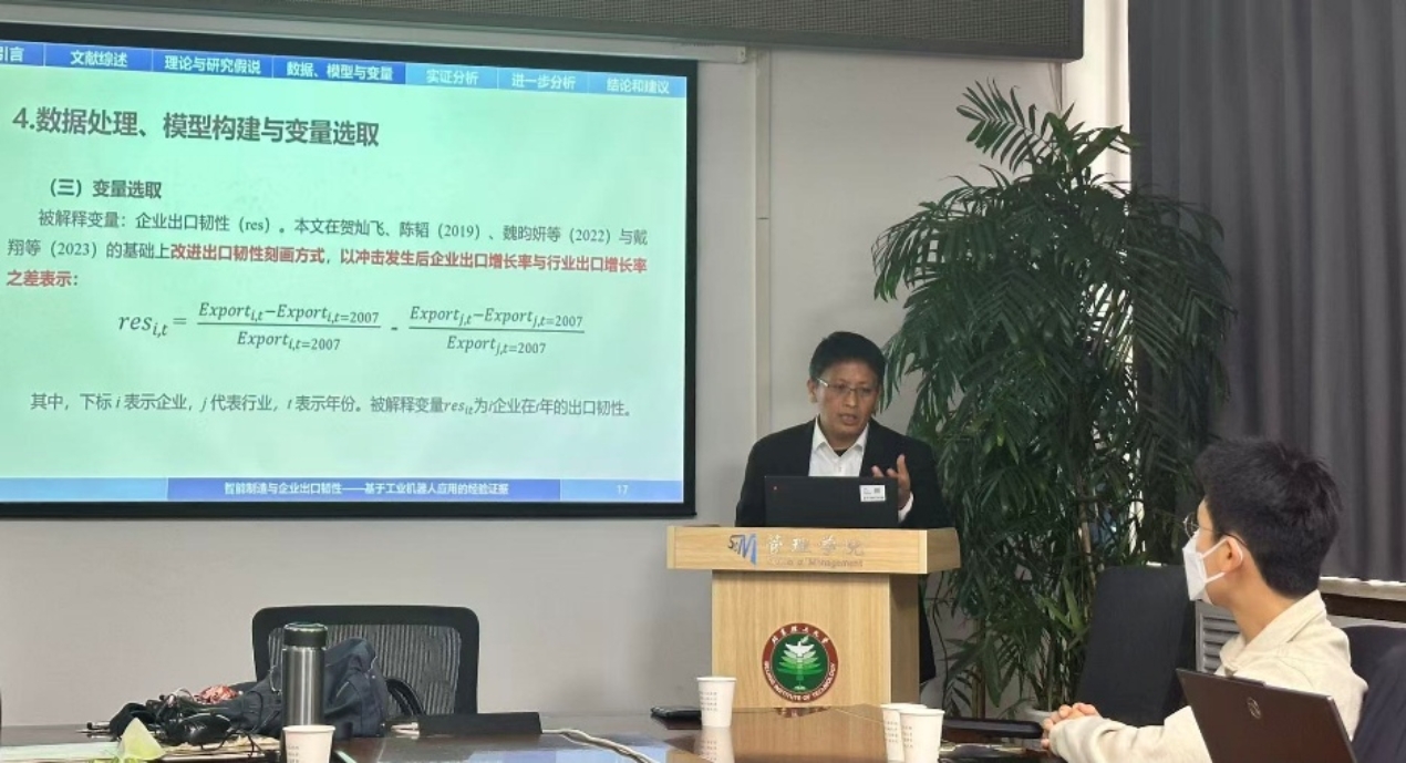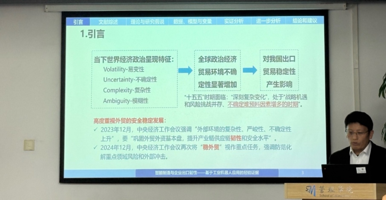 2025年10月31日,北京工业大学经济与管理学院副院长、博士生导师、刘会政教授应邀在中关村主楼418会议室作“智能制造与企业出口韧性——基于工业机器人应用的经验证据”的专题报告。报告会由经济学院赵玉焕教授主持,学院众多师生参加了本次报告会。