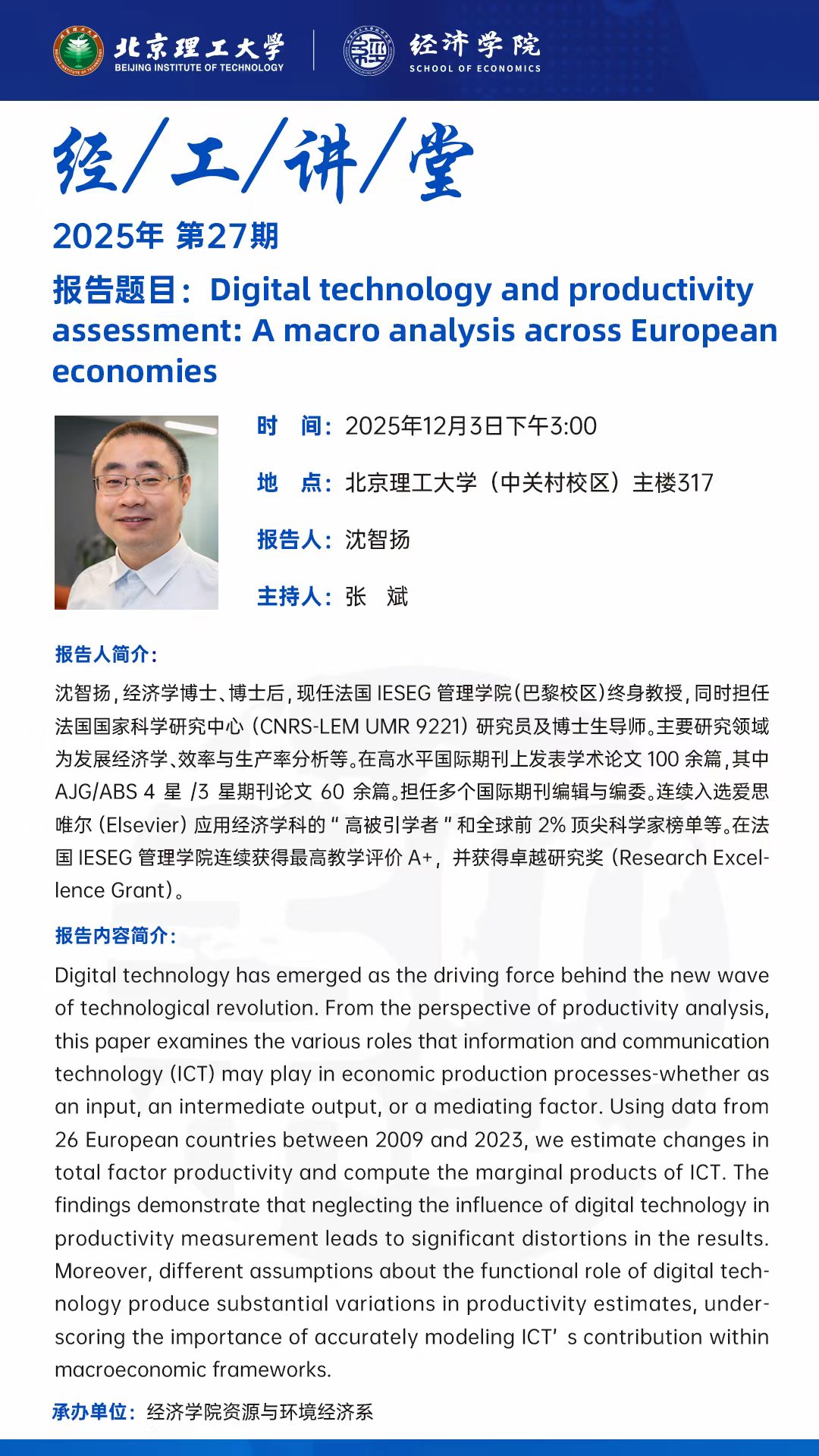 【经工讲堂2025年第27期】12-3 法国IESEG管理学院沈智扬教授: Digital technology and productivity assessment: A macro analysis across European economies