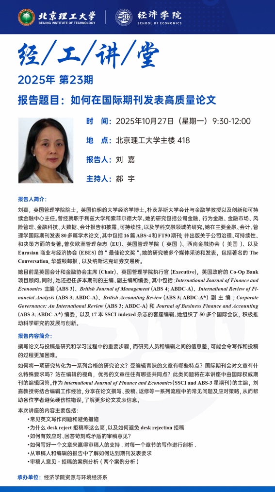 【经工讲堂2025年第23期】10-27 朴茨茅斯大学刘嘉教授:如何在国际期刊发表高质量论文